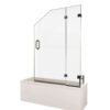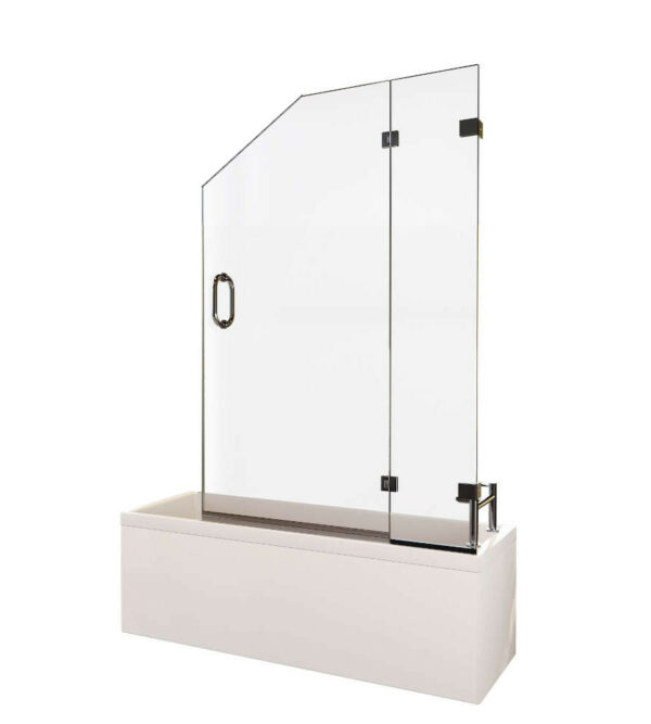 This angled bath screen has the top corner cut off off and is ideal if you have an object protruding from the wall such as a basin unit or radiator. This bath screen can be designed to suit your specific needs and is available in many finishes and glass styles. Perfect for fitting into a loft bathroom or where there is a hindrance such as a structural beam to avoid.