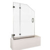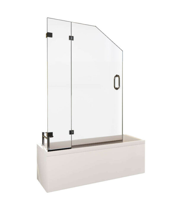 This angled bath screen has the top corner cut off off and is ideal if you have an object protruding from the wall such as a basin unit or radiator. This bath screen can be designed to suit your specific needs and is available in many finishes and glass styles. Perfect for fitting into a loft bathroom or where there is a hindrance such as a structural beam to avoid.