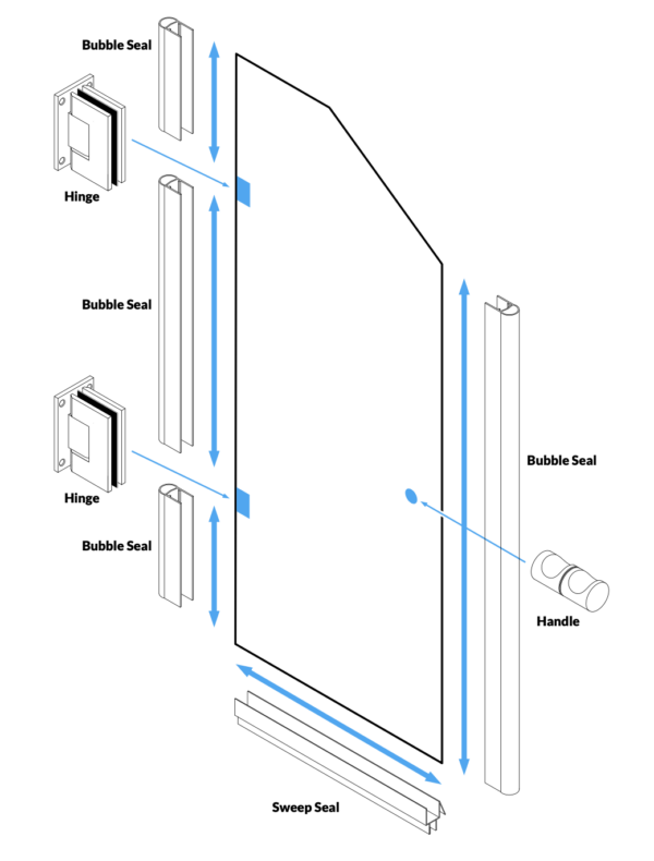 This glass shower door is hinged from the left hand wall and has the top right hand corner cut off to suit (viewed from the outside) and made from a single pain of high-quality toughened safety glass. It’s made to measure (up to 1m wide) and angled perfect for the attic bathroom, to give you the perfect fit in rooms with restricted ceiling height.