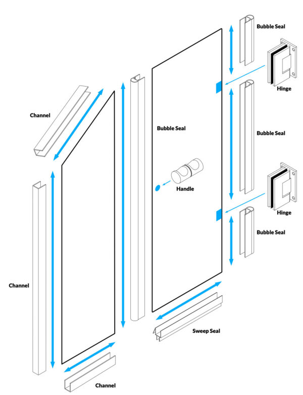 Each door is tailor made to your measurements and unique finishes. Choose from several options such as polished chrome, polished brass or brushed nickel. You can even pick out your own door handle from our custom range, for a shower door that is completely unique to you.