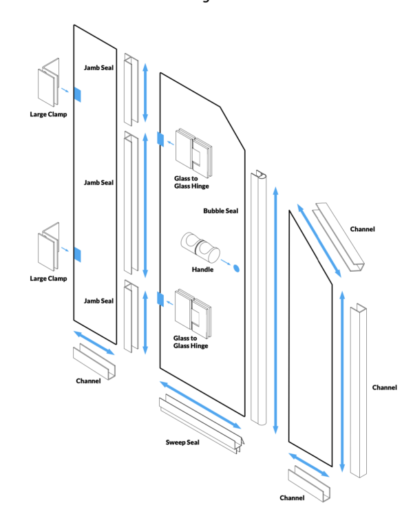This is ideal for showers in difficult spaces, such as under stair cases and loft conversions where a standard shower door would not fit. The average width that we supply in this configuration is around 1350mm but we can make it to fit widths of anywhere between 800mm and a massive 3000mm.